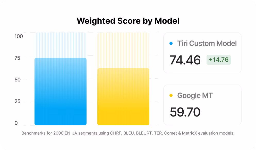 Custom TIRI models are a powerful way for you to scale. They retain your specific brand voice and terminology, continually learn, and consistently outperform machine translation and generic large language models.