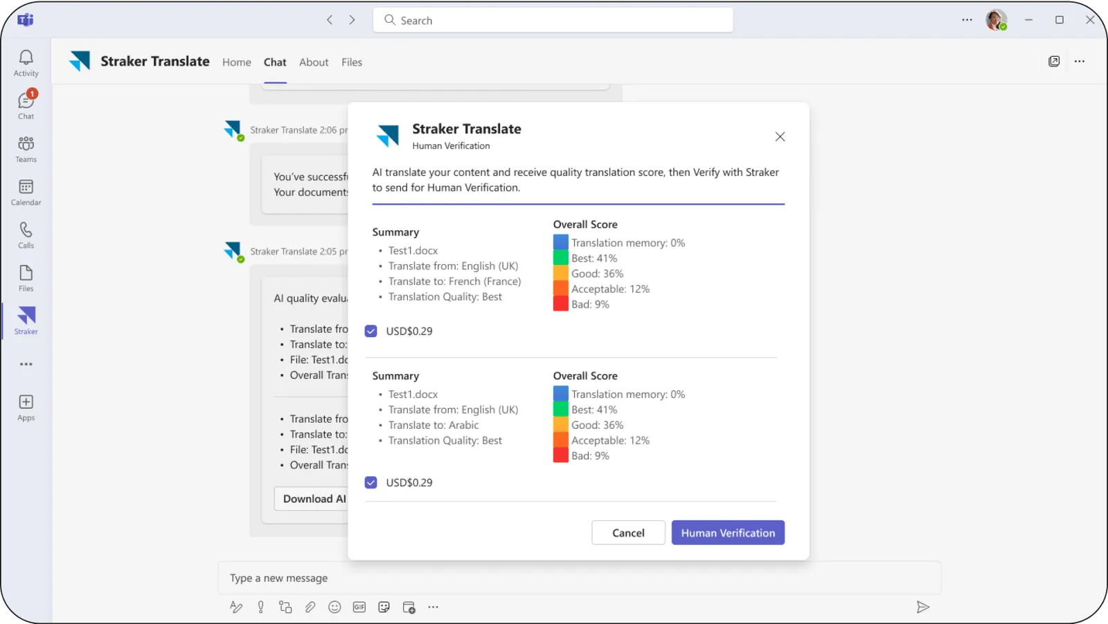 Straker Translate for Microsoft Teams elevates global business productivity by integrating AI-driven translation management directly into your workflow. Your global team can now chat in any language, set up AI translation quality scores for your content, and easily decide when Human Verification is needed -- all without ever leaving Microsoft Teams.